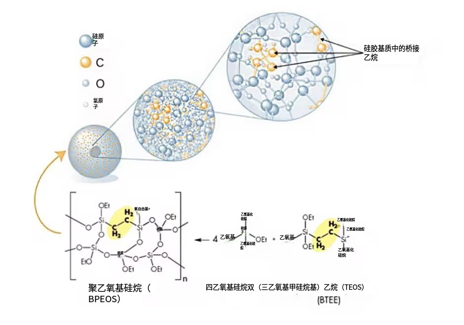 當(dāng)流動(dòng)相 pH>8 時(shí),硅膠骨架中的硅氧烷鍵(–Si–O–Si–)易發(fā)生水解,導(dǎo)致硅膠基質(zhì)溶解。為拓展色譜柱的 pH 適用范圍,行業(yè)內(nèi)開發(fā)了雜化顆粒技術(shù),其核心是在二氧化硅網(wǎng)狀骨架中引入有機(jī)基團(tuán)(通常為乙基或甲基),形成有機(jī) – 無機(jī)雜化基質(zhì)。