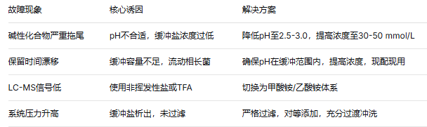 ●??磷酸鹽:紫外截止波長 < 200 nm,緩沖范圍廣,成本低,但不可用于 MS,高有機相易鹽析。