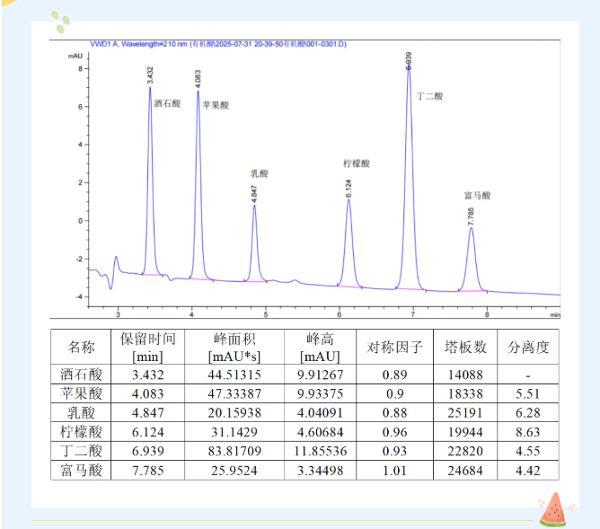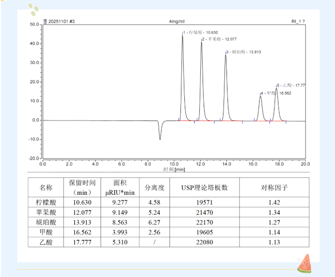檢測(cè)有機(jī)酸至關(guān)重要:含量過高影響風(fēng)味安全,過低則品質(zhì)不達(dá)標(biāo),其“指紋圖譜”還能鑒別果汁真?zhèn)?、判斷發(fā)酵進(jìn)程。但有機(jī)酸極性極強(qiáng)、結(jié)構(gòu)相似,且樣品常呈強(qiáng)酸性,對(duì)分析儀器要求極高。本文使用恒譜生色譜柱,三種不同方法分離不同種類有機(jī)酸,結(jié)果均滿足客戶要求。