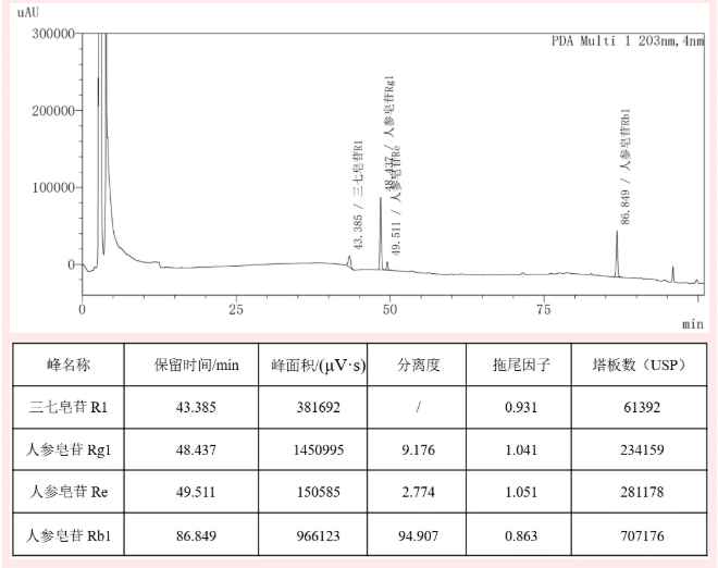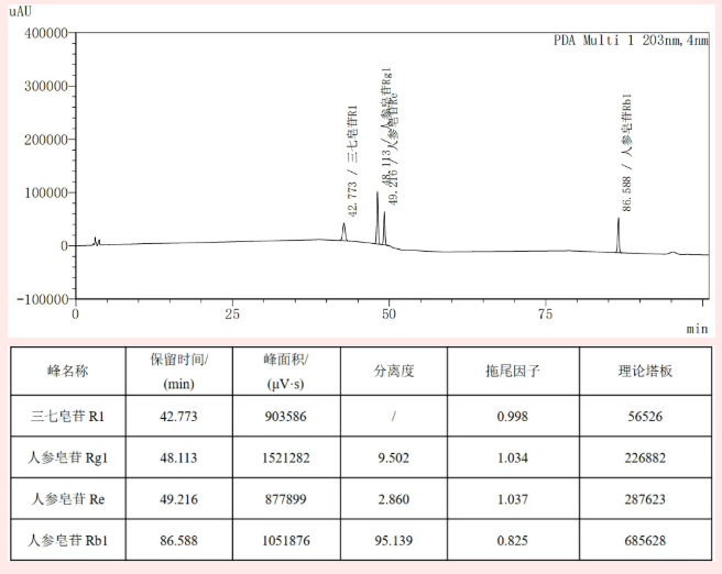 使用恒譜生Hsol?三七皂苷專用柱,5μm,4.6mm×250mm色譜柱,在該條件下,進(jìn)行測試,滿足理論塔板數(shù)按人參皂苷Rg1峰計算應(yīng)不低于6000,人參皂苷Rg1與人參皂苷Re的分離度應(yīng)大于1.8的要求。