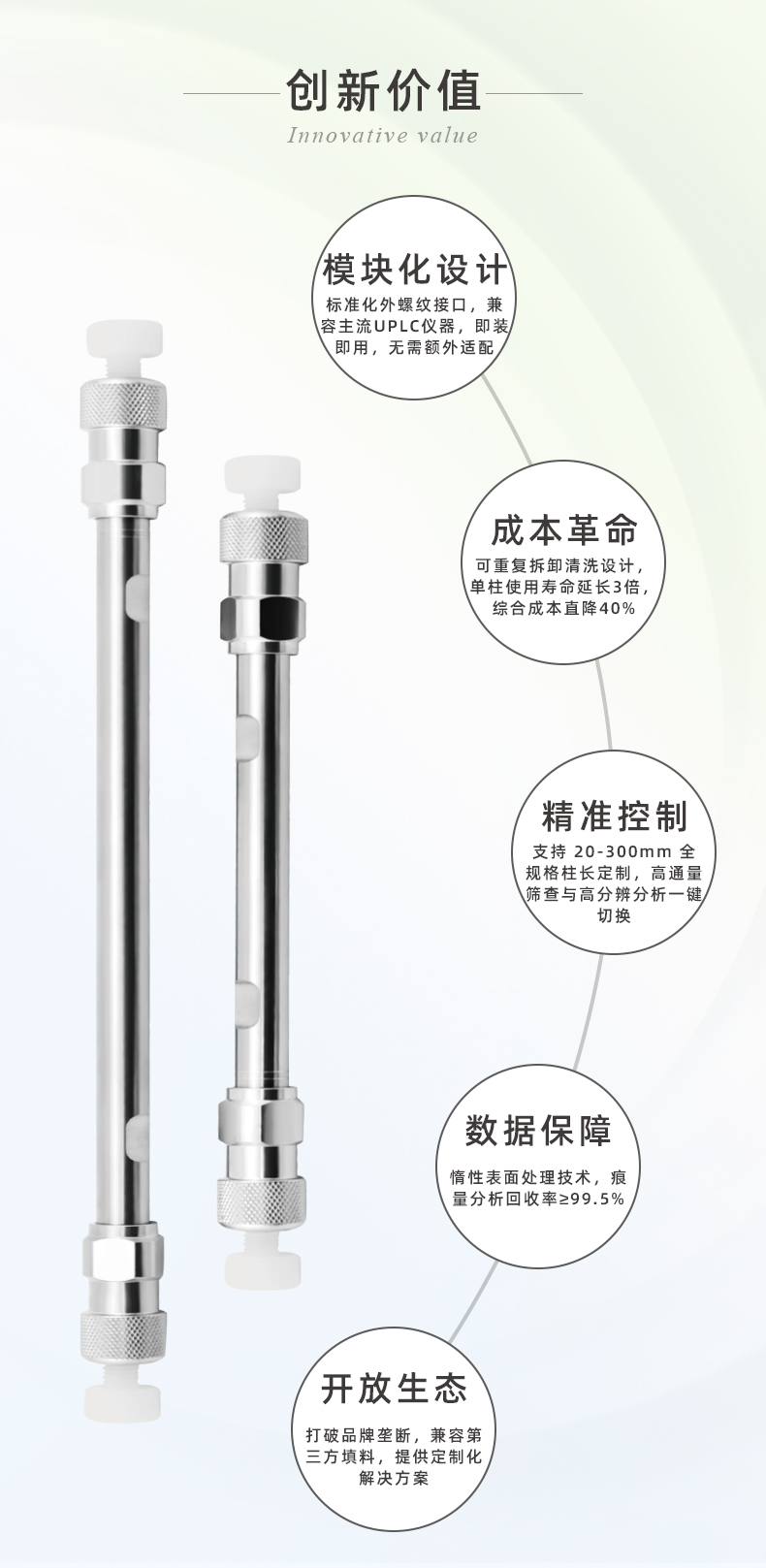 ● 聚四氟乙烯柱管:化學(xué)性質(zhì)穩(wěn)定,耐腐蝕性極佳,內(nèi)壁光滑,適合分析對(duì)金屬敏感的樣品。